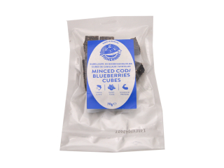 Ingrédients : Poisson – Cabillaud 95 %, 5 % – myrtilles Constituants analytiques : Valeur énergétique pour 100 g de produit : 304 kcal / 1 285 kJ. Protéines brutes : 66,7 %, matières grasses brutes : 3,5 %, glucides : 0,2 % ; fibres brutes : 2,7 %, cendres brutes : 24,28 %, humidité : 10 %, oméga 3 : 1,2 %, oméga 6 : 0,2 %, oméga 9 : 0,8 %