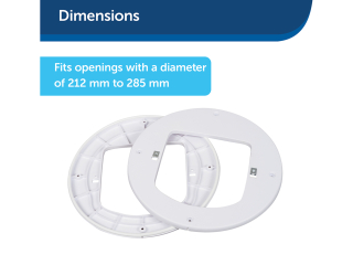 Afmetingen – Deze installatieadapter past in glasopeningen met een diameter van 212 mm tot 285 mm.